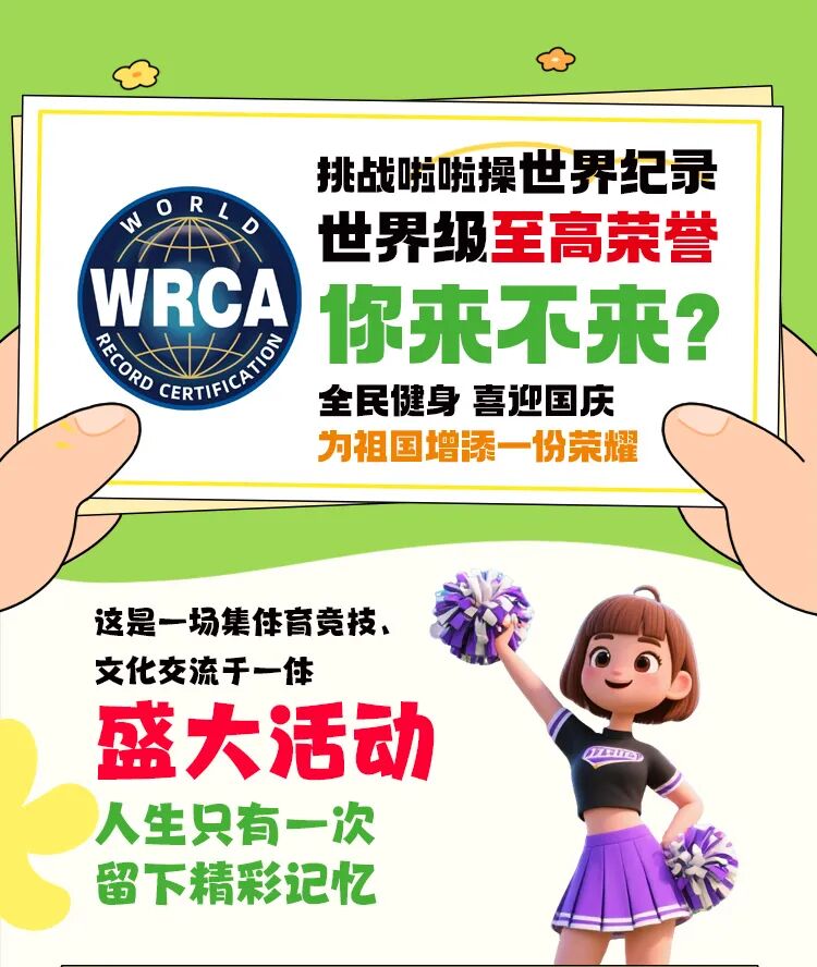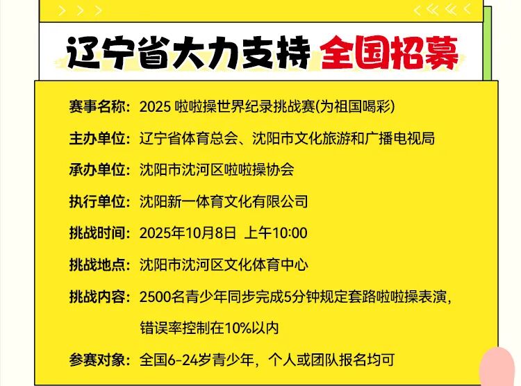 从稚气未脱的孩童到精神矍铄的长者,每一个热爱运动、心怀热血的辽宁人,都是这场盛事的主角。就像杭州曾以2102人的表演打破啦啦操世界纪录那般,我们也将用汗水与热情,在沈城大地留下属于辽宁的运动记忆。在这里,你不仅能感受运动的快乐,更能成为世界纪录的见证者与创造者。