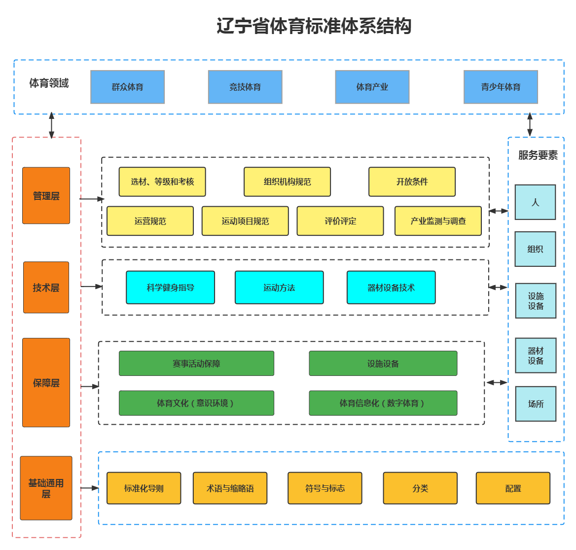 4.技术层.由科学健身指导、运动方法和器材装备技术等组成,给出体育领域统一的技术要求,制定体育技术相关标准有助于科学、合理地利用资源,实现体育项目高质量发展的预期目标,提高经济效益、社会效益。