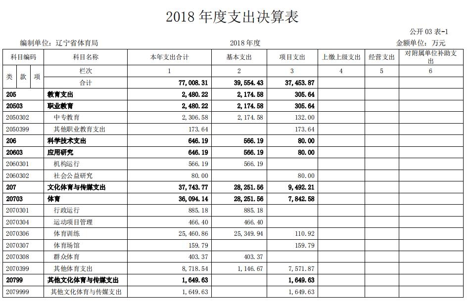 2018年度财政拨款支出75815.63万元,其中:基本支出38884.46元,项目支出36931.17万元。与上年相比,财政拨款支出增加1293.51万元,增长2%,主要原因:一是基本支出增加3603.43万元,主要为新增人员增加的工资、社会保险及公用经费提标等;二是项目支出减少2309.92万元,主要是2017年为全运会比赛年,相应备战及赛事经费较大,今年为调整年,项目支出减少。与年初预算相比,2018年财政拨款支出完成年初预算的103%,其中:基本支出完成年初预算的97%,项目完成年初预算的110%,这里既包括使用当年财政拨款发生的支出,也包括使用以前年度财政拨款结转和结余资金发生的支出。